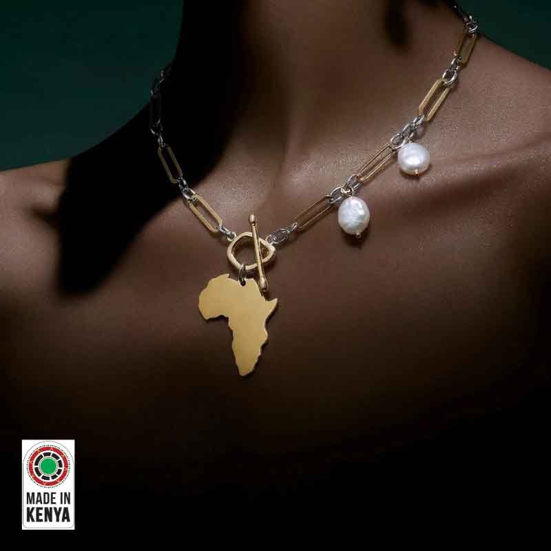 A bold expression of heritage and identity, the Asili Necklace is crafted to stand out. Featuring a two-tone chunky link chain in stainless steel, finished in 24K yellow gold and rhodium plating, this piece is elevated with luminous freshwater button pearls and a signature Africa pendant.
