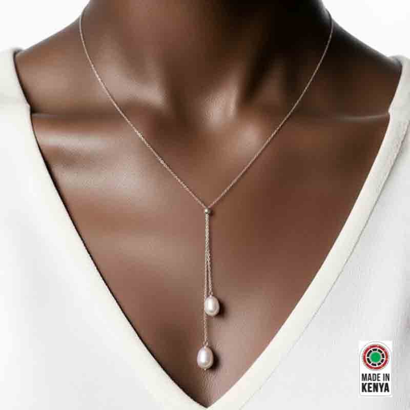 A delicate sterling silver necklace featuring two elegant rice pearl drops. Perfect for everyday wear or special occasions.